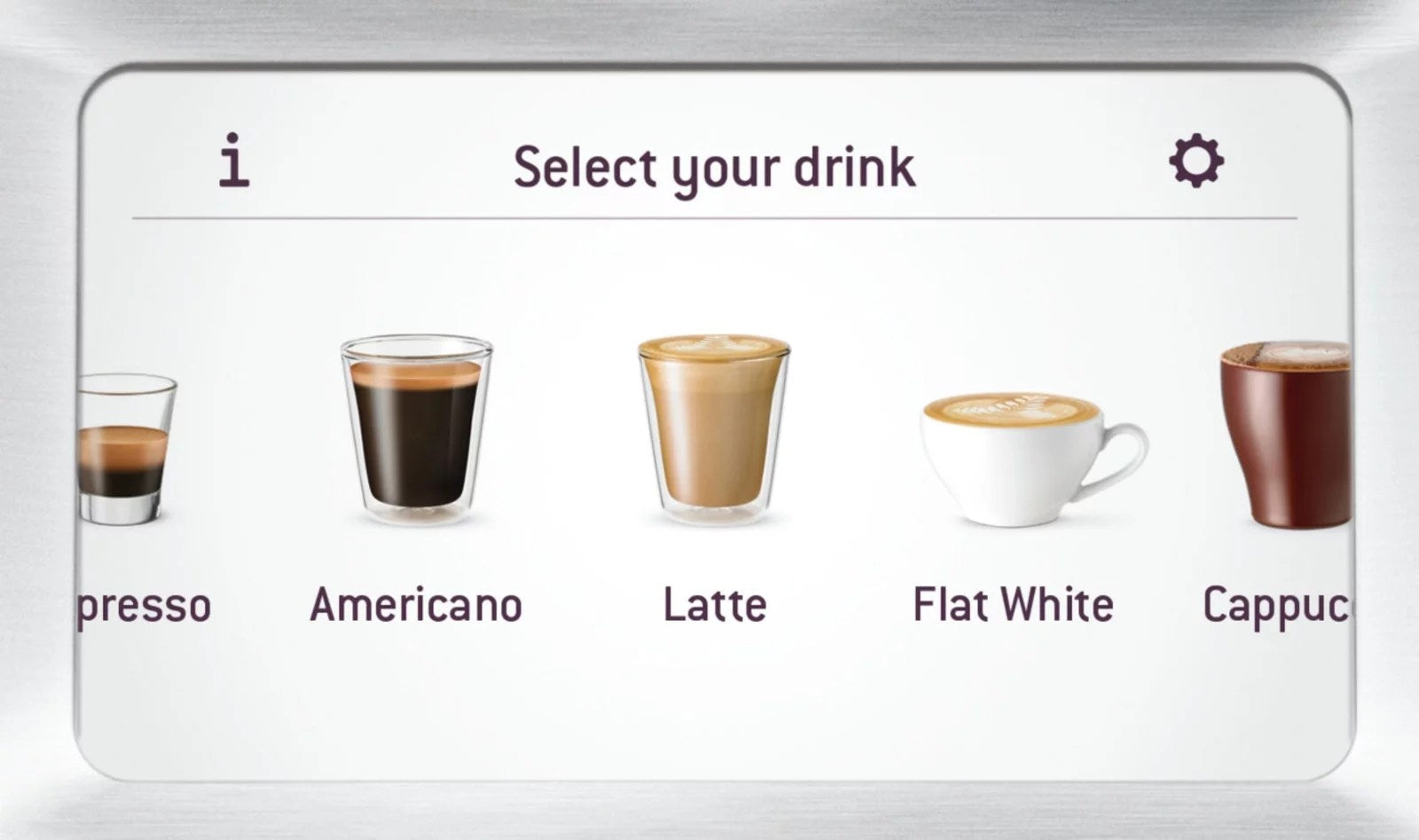 - Pre-programmed to make Espresso, Latte, Flat White, Americano, and Cappuccino with a touch