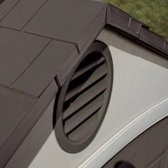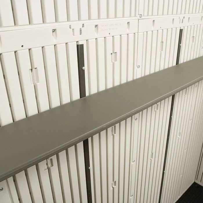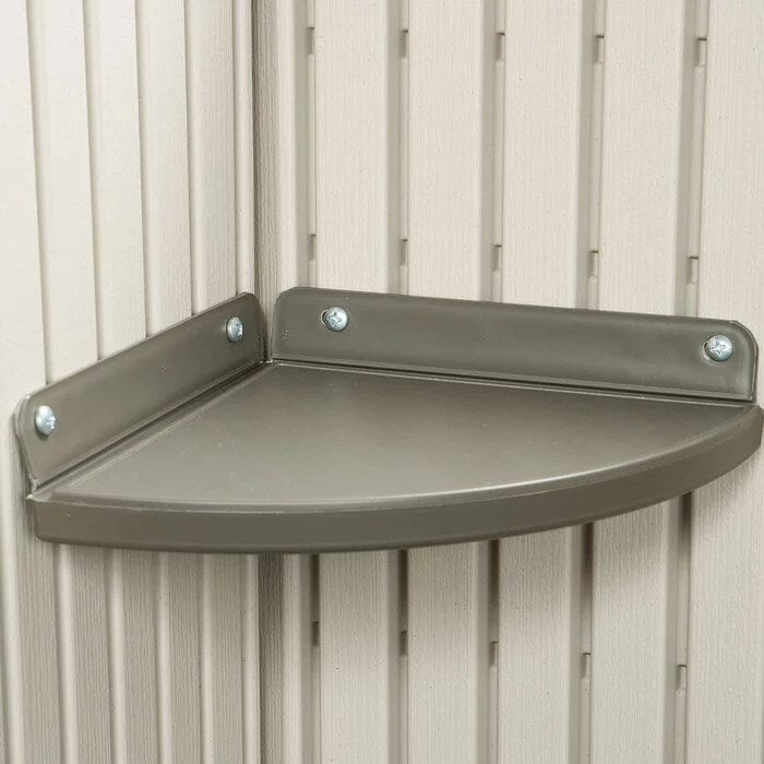 The dual entry 14 ft. 7.5 in. W x 7 ft. 8.7 in. D plastic storage shed provides the perfect storage space for all your tools. This dual entry is the perfect addition to your outdoor space and keeps your tools well-organized. Dd plastic storage shed by lifetime is constructed from steel, HDPE polyethylene plastic that offers years of reliable use. The gable roof lends a traditional style to the garden shed. The desert tan and dark brown finish of the tool shed lends a classic look to it and enhances its overall appearance. It includes two polycarbonate windows with shutters, double doors, two shelves, four corner shelves, two peg strips with tool hooks. The screened vents provide airflow and keep the shed pest free. The high-density and slip-resistant plastic floor provide excellent stability and easier access to tools. It is water and weather resistant that makes it endure most weather conditions. The storage shed is easy and quick to assemble. It is easy to care for and can be wiped with a dry or wet cloth to keep clean. This storage shed is manufactured in the united states.